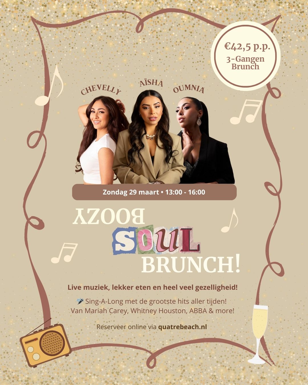 Onze Boozy Brunch is dΓ© perfecte manier om je zondag door te brengen! π₯ Op zondag 29 maart geniet je voor β¬42,50 p.p. (exclusief drankjes) bij QuatreBeach van een uitgebreide lunch en natuurlijk een flinke dosis gezelligheid. Drie geweldige zangeressen zorgen met hun repertoire vol klassiekers van onder andere ABBA, Whitney Houston en Mariah Carey voor een onvergetelijk sing-a-long feest! πΎπ€ Of je nu komt met vrienden of familie: dit is dΓ© brunch waar je blij van wordt! Aanbetaling: β¬20 p.p.